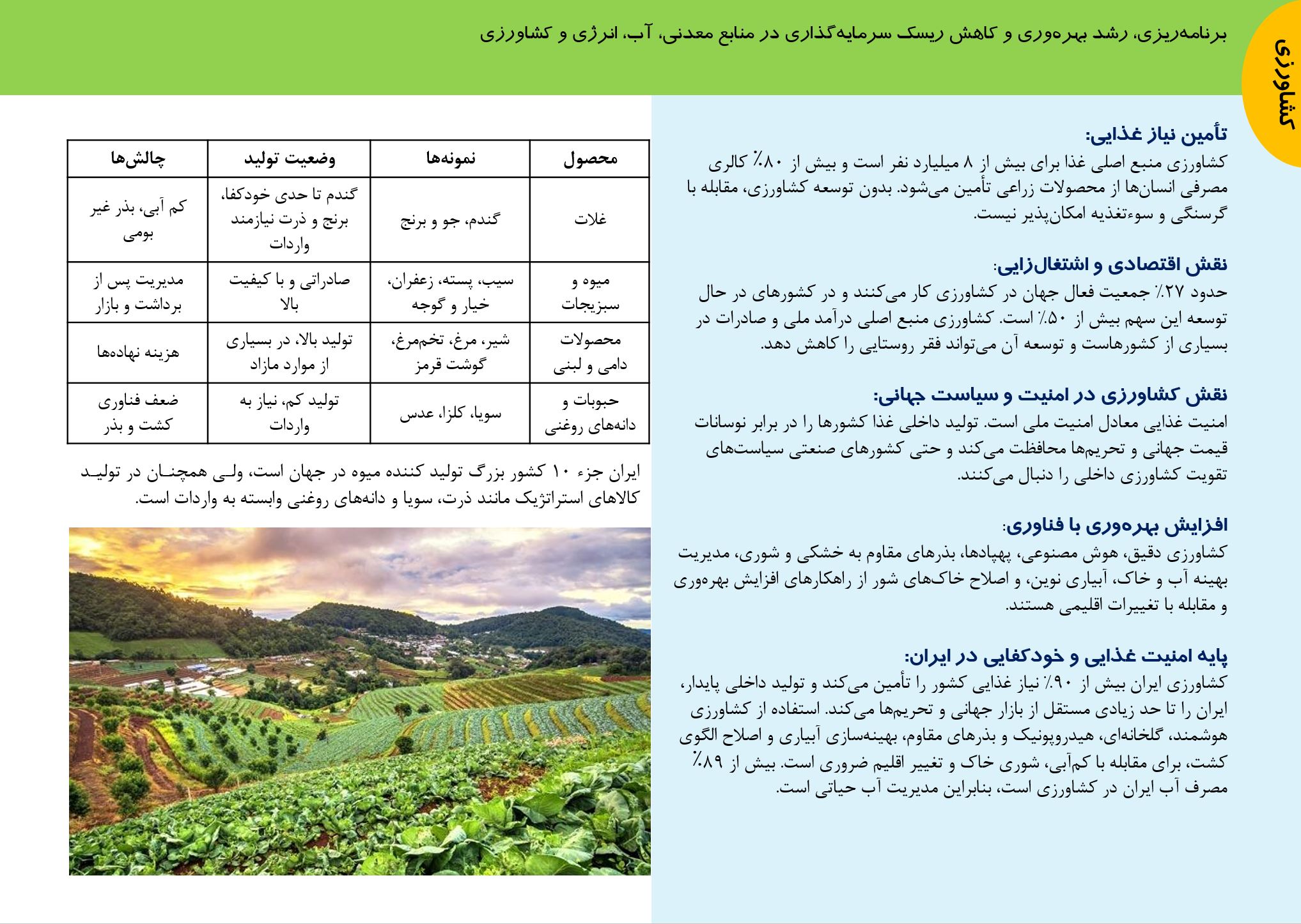 کشاورزی ایران بیش از %۹۰ نیاز غذایی کشور را تأمین میکند و تولید داخلی پایدار، ایران را تا حد زیادی مستقل از بازار جهانی و تحریمها میکند. استفاده از کشاورزی هوشمند، گلخانهای، هیدروپونیک و بذرهای مقاوم، بهینهسازی آبیاری و اصلاح الگوی کشت، برای مقابله با کمآبی، شوری خاک و تغییر اقلیم ضروری است. بیش از ٪۸۹ مصرف آب ایران در کشاورزی است، بنابراین مدیریت آب حیاتی است.